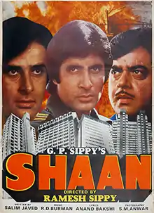 Shaan (translation: Grandeur) is a 1980 Indian Hindi-language action-crime film directed by Ramesh Sippy and produced by G. P. Sippy under the banner of Eros International with a story written by Salim–Javed after the blockbuster success of their previous venture, Sholay (1975). Released worldwide on 12 December 1980, the film stars an ensemble cast of Sunil Dutt, Shashi Kapoor, Amitabh Bachchan, Shatrughan Sinha, Rakhee Gulzar, Parveen Babi, Bindiya Goswami, Johnny Walker and Kulbhushan Kharbanda. The music was composed by R. D. Burman.
