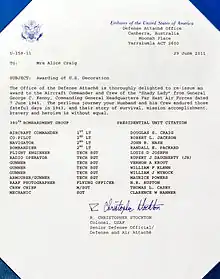 Mrs Alice Craig, wife of the commander Doug Craig, was presented in August 2011 with a Presidential Citation by Major Christopher M Westhoff, US Marine Attaché in Canberra. The citation was issued to Mrs Craig just days before she visited the crash site on 14 August 2011. It was 68 years to the day since Shady Lady had crash landed there.