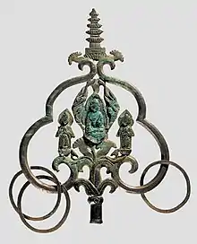 The basic design of a khakkhara is of a central staff, normally in wood, topped by a finial in metal, with a looped design, from which smaller metal rings hang on each side (similar to the stringing of traditional Chinese cash).[3] Various numbers of loops and rings are employed, with each number being assigned symbolic significance on the basis of a variety of Buddhist numerical formulas.[3] Historical examples from the Famen Temple include staffs with one, two, or four loops and four, six, or twelve rings on each loop.[3]