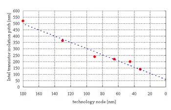 Scaling of isolation with transistor size. Isolation pitch is the sum of the transistor width and the trench isolation distance. As the isolation pitch shrinks, the narrow channel width effect becomes more apparent.