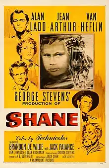 Shane is a 1953 American Technicolor Western film starring Alan Ladd, Jean Arthur, and Van Heflin. Released by Paramount Pictures,[4][5] the film is noted for its landscape cinematography, editing, performances, and contributions to the genre.[6] The picture was produced and directed by George Stevens from a screenplay by A. B. Guthrie Jr.,[7] based on the 1949 novel of the same name by Jack Schaefer.[8] Its Oscar-winning cinematography was by Loyal Griggs.