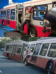 Two buses were shipped to Sydney for filming the sequence's interior shots. These buses were taken apart and re-assembled on a 15 feet (4.6 m) high gimbal and a 3.3 feet (1.0 m) high gimbal, with the windows and seats removed most of the time for safety.[77][105] The sequence was partially completed when the production shut down for COVID, requiring those involved to "retune" once production resumed.[105] Filming for the interior shots took around six weeks.[88] The exterior shots were filmed in San Francisco, with a different crew due to the pandemic.[77] The visual effects team planned out the shoot remotely so the unit could get the footage that was needed.[88] Four more buses were used for this portion of the sequence, including one that was filmed crashing down a hill into several cars.[104] The entire sequence was shot in 48 fps to help with tracking and making adjustments, and was then converted back to 24 fps. The shots in slow-motion were shot at 250 fps using a Phantom Camera.[88] The sequence ends at a real intersection in San Francisco that was partially filmed in Sydney and combined with footage from San Francisco by the visual effects team.[77] Cretton said there were some "fudges" in how accurate the sequence was to San Francisco—"you can't go downhill for six minutes straight"—but was mostly based on a real route,[104] suggested by Chan.[77] The bus is meant to be a Muni bus but different branding was used due to that company not wanting to be associated with a crashing bus.[104]