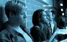 The music video for "Shape of My Heart" was directed by Matthew Rolston at the Orpheum Theatre in Los Angeles. The entire video is shot in monochrome with a blue tint, creating a black and blue atmosphere in reference to the album's name.[3] Rolston was inspired by "classic photography", utilizing the blue tint to evoke earlier periods of photography, as well as showcasing a mature side of the band in place of their previous over-the-top videos.[3] On MTV's Total Request Live the music video broke the Backstreet Boys' own record for longest-running number-one song, which was previously held by "Larger Than Life" (1999). The video spent 65 days at the top position. As of May 2023, the music video has over 308 million views on YouTube.[6] In a 2023 video posted to the band's YouTube account, Brian Littrell said he still owns the jacket he wore in the video.[7]