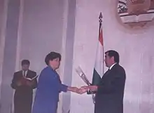 President Emomali Rahmon awarding Deputy Prime Minister Bozgul Dodkhudoeva with the order in 1990.