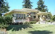 Hanchett Residence Park was developed beginning in 1907 by Lewis E. Hanchett on the site of the Agricultural Park amusement and exhibition grounds west of the Alameda.[1][2] Hanchett provided electric streetlights, streetcar service, and a modern sewer system.[3] The streets were laid out by John McLaren, supervisor and designer of Golden Gate Park in San Francisco,[4] who located the utility poles in backyards to keep the sidewalks open and specified the trees to be planted 20 feet apart on each street.[3] Most of the houses were built between 1915 and 1930 in Craftsman, Mission Revival, and Spanish eclectic styles; there are a few Prairie style houses and some Queen Anne style Victorian houses dating to before the development.[3][5] Hanchett Park contains San Jose's greatest concentration of 191020 Craftsman houses.[1]