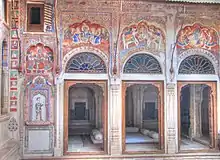 The great merchant era of patronage began around 1830 when Shekhawati merchants, settled in Calcutta and elsewhere, began to pour money back to their hometowns, much of which was turned to conspicuous building.[2] By then, under British protection, they were no longer shy of drawing attention to their wealth. The most obvious blossoming of wall-paintings in Shekhawati is on late 19th and early 20th century havelis. They aimed to construct five buildings: a haveli, a temple, a memorial chhatri, a well and a caravansarai.[3] Most were painted. The havelis offer the most variable subject matter, but temples, memorial chhatris and cupolas decorating wells are often richly decorated.