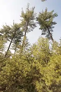 In other situations, the undesired species is more shade tolerant than the desired species. In this case, foresters will forgo the preparatory cut (which might invite early germination of the undesired shade-tolerant) and perform a heavier than normal establishment cut, giving the desired species enough resources to establish and outgrow the undesired species. The (partial) overstory removal quickly follows, continuing to give the desired species the resources to outgrow its competitor. In the example below, the very shade tolerant balsam fir established in an earlier harvest, and is preventing the establishment of moderately shade tolerant eastern white pine.