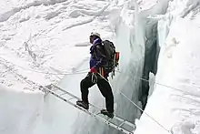 On 18 April 2014, a serac collapsed above the Khumbu Icefall on Mount Everest, causing an avalanche of massive chunks of ice and snow which killed 16 Nepalese guides, mostly Sherpas.[19] The 2014 avalanche is the second-deadliest disaster in Everest's history, only exceeded by avalanches in the Khumbu Icefall area a year later, on 25 April 2015, caused by a magnitude 7.8 earthquake in Nepal. In response to that tragedy and others involving deaths and injuries sustained by Sherpas hired by climbers, and the lack of government support for Sherpas injured or killed while providing their services, some Sherpa climbing guides walked off the job, and some climbing companies are no longer providing guides and porters for Everest expeditions.[20][21] The Khumbu Icefall is essentially a waterfall of ice with continuous structural shifts, requiring continuous changes to the route through the area[22] and making this is one of the most, if not the most, dangerous parts of climbing Mount Everest. Climbers have to walk on ladders over crevasses, while walking underneath large serac formations that could potentially fall at any moment. Oftentimes the journey through the Khumbu Icefall is in the pitch black. It is safer for climbers to go through the icefall at night because the temperatures at night drop. Therefore, the icefall is not melting as fast as it would during the day.[23] These dangers have resulted in 66 deaths as of 2017, including 6 deaths from falling in a crevasse, 9 deaths from a collapse in a section of the icefall, and 29 deaths from avalanches onto the icefall.[24] The families of those who died in the avalanche were offered 40,000 rupees, the equivalent of about $400 US dollars, from the Nepalese government.[25] At the time of the disaster, the Sherpas were carrying loads of equipment for their clients, including many luxury items.[26] There had been two broken ladders causing a traffic jam in the Khumbu Icefall.[27] It is not uncommon for Sherpas to go through the Khumbu Icefall around 30 times each season; in comparison, foreigners only go through the icefall 2 or 3 times during the season.[28] Sherpas are expected to haul the majority of their clients' gear to each of the five camps and to set up before their clients reach the camps. During each season, Sherpas typically make up to $5000 US dollars during their 2 or 3 month period of taking international clients to the summit of Everest.[29] As of 2019, expeditions on Mt. Everest contributed $300 million.[30] The economy of Nepal thrives off of tourism and adventure seekers.