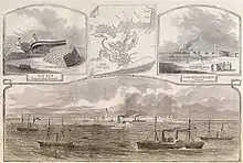 The island possesses a very superior harbor, into which nineteen feet can be carried at ordinarily low water. It is situated north of the west end of the island. The anchorage, with water equal to the depth on the bar, is five miles long [8 km], and averages three and a quarter miles [5 km] in width. The harbor is safe for the most dangerous storms in the Gulf—those from the eastward, southward and eastward, and southward—and might be easily entered during these storms without a pilot if good light-houses were placed in proper positions. The rise and fall of the tide is only from twelve to fourteen inches [31-36 cm].FORT MASSACHUSETTS, of which we give an illustration, is thus described in the Herald letter:Accompanying Harper's Weekly January 4, 1862 illustration of Ship Island and Fort Massachusetts.