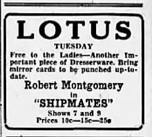 Shipmates is a 1931 American Pre-Code comedy film directed by Harry A. Pollard and written by Louis F. Edelman, Delmer Daves, Raymond L. Schrock, Frank Wead, and Malcolm Stuart Boylan. The film stars Robert Montgomery, Ernest Torrence, Dorothy Jordan, Hobart Bosworth, Cliff Edwards and Gavin Gordon. The film was released on April 25, 1931, by Metro-Goldwyn-Mayer.[1][2]