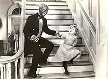 In addition to Dunn, Temple danced in her films with some of the most famous and accomplished entertainers of her era: Buddy Ebsen, Jack Haley, Alice Faye, George Murphy, Jimmy Durante, Charlotte Greenwood, and Jack Oakie. Bill "Bojangles" Robinson was her favorite partner.[6] "It was kind of a magic between us", she later reminisced, and said he taught her how to execute her dance moves by syncing with the rhythm of the music, as opposed to watching her steps.[7] In 1935's The Little Colonel, the first of their four films together, they made history as the first interracial couple to dance on screen.[8][9]