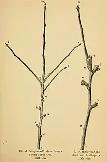 Many woody plants have distinct short shoots and long shoots. In some angiosperms, the short shoots, also called spur shoots or fruit spurs, produce the majority of flowers and fruit. A similar pattern occurs in some conifers and in Ginkgo, although the "short shoots" of some genera such as Picea are so small that they can be mistaken for part of the leaf that they have produced.[3]