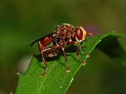 Their larvae are endoparasites of bumble bees of the genus Bombus[5] (B. lapidarius, B. terrestris , B. hortorum, B. pascuorum, etc.). They pupate and overwinter in their victims.[7]