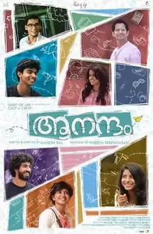 Aanandam (English: Joy) is a 2016 Indian Malayalam-language coming of age film written and directed Ganesh Raj in his directorial debut.[3] Cinematography was by Anend C. Chandran. Vineeth Sreenivasan produced the film under the banner Habit of Life in association with Vinod Shornur under Cast N' Crew.[4] Aanandam follows the life of seven sophomore engineering students as they embark on their first college tour.
