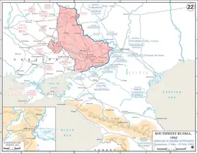 After delays in moving troops into position and logistical difficulties, the Kharkov operation began on 12 May. The Soviet troops achieved initial success and 6th Army commander Friedrich Paulus requested reinforcements. Three divisions slated for Case Blue and air units from Crimea were diverted to the Kharkov sector. The advance of Southwestern Front's northern strike group was halted by a German counterattack that began on 13 May, while the front's southern strike group continued its progress 40 kilometers into the German rear.[46] In response, Ewald von Kleist's two armies launched a counterattack, Operation Fridericus I, on 17 May against the Southern Front, covering the Southwestern Front's southern flank. Kleist's counterattack caught the Soviet defenders off guard, with Timoshenko having committed his armored reserves to the Kharkov operation. In the ensuing Second Battle of Kharkov, Kleist's forces encircled and destroyed much of the forces of the Southern Front and the advancing Southwestern Front, inflicting over 300,000 casualties in return for losses of 20,000. The disaster at Kharkov was a crippling blow to the Soviet forces in the south, leaving them vulnerable to the forthcoming German summer offensive. Despite the defeat, Stalin continued to believe that a German attack on Moscow was the main threat and allocated four newly formed strategic reserve armies there rather than to the Southwestern Main Direction. Instead, the Southwestern Front received seven rifle divisions and three tank corps, which proved inadequate to deal with the German threat.[47]