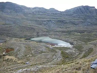 The landscapes in the Sierra Nevada del Cocuy are characterized by glacial landforms that were carved and deposited by the advancing and retreating glaciers throughout the Pleistocene Epoch, such as moraines, cirques and glacial valleys. However, the high tectonic activity and continuous uplift in the region has led to widespread bedrock outcroppings (mostly sedimentary rocks) which give the overall shape and elevation of the area, also characterized by faulting and folding of the Cretaceous rocks. Additionally, fluvial and hillslope processes are considerable influences on the landscape as well. Because of this, preservation of glacial landforms is inversely related to their age and, in turn, directly related to their altitude.[10] For example, the steep walls of the glacial U-shaped valleys are made up mostly of quartzitic sandstones and shales, which leads to fragile slope failure and rock falls. These processes lead to the formation of big and widespread colluviums which cover up, or mix with, preexisting moraines or fluvial deposits. Also, as a tropical glacier system, freezing and thawing cycles in the Cocuy glaciers occur on a day-to-night basis, making seasonality of ice advance and retreat non-existent and geomorphological phenomena less straight-forward, which has been hypothesized to be an explanation for the compact aspect of the moraines.[10] Nevertheless, glacial geomorphological features are pervasive such as terminal and lateral moraines, cirques, U-shaped valleys, proglacial, marginal and supraglacial lakes and ice caps. A geological map from Ingeominas [15] shows the distribution of quaternary (glacial) deposits, colluvium and alluvial deposits, as well as bedrock outcroppings.
