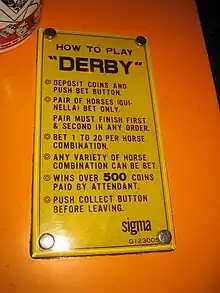 Sigma Derby is an electro-mechanical horse race used for gambling manufactured by Japanese manufacturer Sigma Game Inc. and introduced in 1985.[1] Up to ten players can buy in with quarters and place bets on the five horses; a quinella of two horses in any order pays out according to the odds. The house has roughly a 10-20% advantage, depending on the machine.[2]