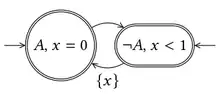 As for finite automaton, incoming arrows represents initial locations and double circle represents accepting locations. However, contrary to finite automata, letters occurs in locations and not in transition. This is because letters are emitted continuously and transitions are taken discretely. The symbol represents a clock. This clock allow to measure the time since the last time where was emitted. Thus ensures that is emitted discretely. And ensures that no more than a unit of time can pass without occurring.