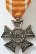 The Silver Memorial Cross 1813-1815, (Dutch: Zilveren Herdenkingskruis 1813-1815) was a campaign medal instituted by King William III of the Netherlands on 10 May 1865. It was awarded to surviving veterans of the Dutch armed forces who, between 1813 and 1815, helped to restore Dutch independence. This included participating in the 1814 campaign to end the occupation of the Netherlands by Napoleon's French forces, and in the final Hundred Days campaign of 1815, including the battles of Quatre Bras and Waterloo.[1]