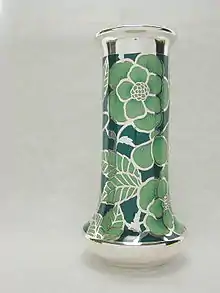 An outstanding figure is Friedrich Wilhelm Spahr. There is evidence that he learned his skill from Friedrich Deusch (some items of both firms have very similar formal designs). He was not only an artisan but an artist in developing repeating circumferential forms in a perfect and harmonic proportion. Very often it is the pure arrangement of lines (curved or straight), or their combination, with flowers or birds. Never over-designed, but enough to divide the small surface (for example of a vase) in a self-evident and harmonious way. Like the others, not only did he design and apply the silver overlay, he also prepared the porcelain with his own enamel colors, painted the motifs and engraved the silver. Of course he did not produce all these items by himself. Spahr's factory employed about forty specialized workers. The outstanding engraved pieces show the unrivaled quality of Spahr.[17]