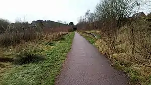 ![]() The site of Silverdale station and the former Silverdale Colliery, now the end of the greenway from Newcastle-Under-Lyme. The platforms are all that remain in situ. | |