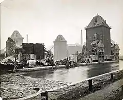 On 19 January, a fire broke out in the melt-pot room, and efforts to put it out were under way when approximately 50 long tons (50 t) of TNT ignited at 6:52 pm. The TNT plant was destroyed instantly, as were many nearby buildings, including the Silvertown Fire Station. Much of the TNT was in railway goods wagons awaiting transport.[4] Debris was strewn for miles around, with red-hot chunks of rubble causing fires. A gas holder was damaged on Greenwich Peninsula, creating a fireball from 200,000 cubic metres (7,100,000 cu ft) of gas; the holder was later repaired and remained until 1986. Several thousand pounds' worth of goods were also destroyed in nearby warehouses, estimated by the Port of London Authority to span 7 hectares (17 acres).[5] The chancel and church hall of the local church, St Barnabas', were destroyed, only to be replaced in 1926.[6]
