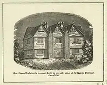 Simon Bradstreet was baptized on March 18, 1603/4[1] in Horbling, Lincolnshire, the second of three sons of Simon and Margaret Bradstreet. His father was the rector of the parish church, and was descended from minor Irish nobility.[3] With his father a vocal Nonconformist, the young Simon acquired his Puritan religious views early in life.[4] At the age of 16, Bradstreet entered Emmanuel College, Cambridge. He studied there for two years,[5] before entering the service of the Earl of Lincoln as an assistant to Thomas Dudley in 1622.[6] There is some uncertainty about whether Bradstreet returned to Emmanuel College in 1623–1624. According to Venn, a Simon Bradstreet attended Emmanuel during this time, receiving an M.A. degree,[5] but genealogist Robert Anderson is of the opinion that this was not the same individual.[7] During one of Bradstreet's stints at Emmanuel he was recommended by John Preston as a tutor or governor to Lord Rich, son of the Earl of Warwick.[6] Rich would have been 12 in 1623, and Preston was named Emmanuel's master in 1622.[8][9]