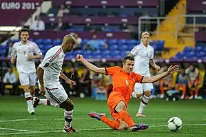 Following the World Cup tournament, Poulsen was called up to the national team two months later and started against Germany on 11 August 2010, only to suffer an injury and was substituted in the 28th minute, as the national team drew 2–2.[177] It wasn't until on 1 February 2011 when he was called up to the national team once again.[178] Poulsen was featured against England on 9 February 2011 and was at fault for conceding an equalising, leading him to be substituted at half time, as Denmark lost 2–1.[179] Despite this, he was later featured three more matches in the UEFA Euro 2012 qualifying, helping Denmark qualify for the UEFA Euro 2012 after coming on as a 76th-minute substitute to help the national side beat 2–1 Portugal on 11 October 2011.[180] In May 2012, Poulsen was inducted in the final squad for Euro 2012.[181] He started in the tournament against Netherlands on 9 June 2012 and set up a goal for Michael Krohn-Dehli, who scored the only goal of the game to help Denmark win 1–0.[182] After the match, Ekstrabladet said about his performance, saying: "If you can talk about revenge from the World Cup two years ago, he got it. He's only grown a few levels. Tactically and playfully, it's great to see how unimpressed he goes to work. The robe was most often shut down. In the first half he was the Dane with the most passes."[183] He then featured two more matches in the tournament for the national team, playing in the left–back position against Portugal and Germany, as they were eliminated in the group stage.[184]