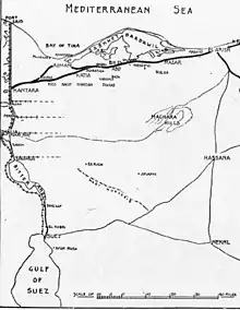 The intact water cistern and wells on the central road across Sinai still enabled Ottoman Army forces to threaten the Canal at any time.[43] Between 11 and 15 April, 25 Bikaner Camel Corps, 10 Engineers with 12 men from 8th Light Horse Regiment and 117 men from 9th Light Horse Regiment (30 light horsemen armed as Lancers), with 127 Egyptian Camel Transport Corps travelled 52 miles (84 km) to destroy a well-boring plant, gyns erected on the wells, the water wells and pumping equipment at Jifjafa. They captured an Austrian engineer officer and 33 men, four of whom were wounded, and killed six Ottoman soldiers.[44][45] On 9 June 1916 units from No. 2 Section of the Canal Defences formed the Mukhsheib column, consisting of part of the 3rd Light Horse Brigade, 900 camels, non-fighting units and camel transport escorted by one squadron of 9th Light Horse Regiment and 10 Bikaner Camel Corps. The engineers drained pools and cisterns of five million gallons of water in the Wadi Mukhsheib, sealed the cisterns to prevent them refilling during next season's rains and returned on 14 June. At the same time a detachment of Middlesex Yeomanry advanced to Moiya Harab. With the central Sinai route now denied to them, Ottoman forces could only advance towards the Suez Canal along the northern coast.[46][47]