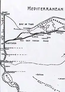 Murray planned a 50,000-strong garrison in the Katia area and obtained authority to build a pipeline to pump fresh Nile water and a railway to transport the infantry divisions and their supplies.[40] He also decided to empty the water cisterns at Moya Harab so the central Sinai route could not again be used by Ottoman columns advancing from Palestine and to maintain some troops at Suez to defend the town.[41] These operations began in February 1916 when construction started on the 25 miles (40 km) stretch of 4-foot 8 inch standard gauge Sinai railway and water pipeline from Qantara/Kantara to Qatiya/Katia.[39][40] By the end of March or early in April 16 miles (26 km) of track, including sidings, had been laid.[42]