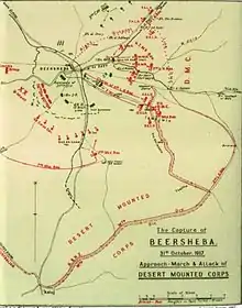 A reconnaissance in force to Bir el Mazar was carried out by the 2nd and 3rd Light Horse Brigades, the 1st Battalion, of the Imperial Camel Corps Brigade (ICCB), the New Zealand Machine Gun Squadron and the ICCB's Hong Kong and Singapore Battery, on 16–17 September 1916. At the limit of their line of communication the light horse, infantry, machine guns and artillery were not able to capture the 2,000 strong, well entrenched garrison which made a determined stand. After demonstrating the strength of the advancing army, they successfully withdrew back to Anzac Mounted Division's Headquarters at Bir Sulmana 20 miles (32 km) to the west. The Ottoman force abandoned Bir el Mazar shortly after.[82][88][104][105] The report of the 2nd Light Horse Brigade described their 5th Light Horse Regiment being fired on by anti-aircraft guns during the operations and reported one man killed and nine wounded.[106] The 3rd Light Horse Brigade recorded that the troops of the Imperial Camel Corps Brigade and the artillery battery were unable to move quickly enough to take part in the attack, and their brigade lost three killed, three wounded and two injured.[107] Airmen of No. 1 and No. 14 Squadrons confirmed anti-aircraft guns fired on the light horse, describing the ground engagement as so tough the Ottoman Army soldiers resorted to this extreme measure, turning their anti-aircraft guns away from the attacking planes. The Ottoman soldiers withdrew to the Wadi El Arish, with garrisons at Lahfan and Magdhaba.[108]