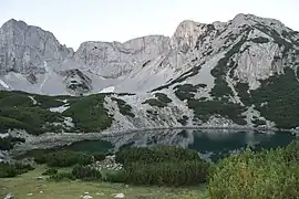 The Sinanishko Lake (Bulgarian: Синанишко езеро) is a glacial lake in the Pirin mountain range, southwestern Bulgaria, situated about 700 m to the north–northeast of the summit of Sinanitsa (2,516 m) in the small Sinanitsa cirque at an altitude of 2,181 m.[1][2][3] Reaching depth of 11.5 m, it is among the ten deepest lakes in the mountain range. It has an elongated shape with maximum length of 175 m and a width of 80 m. The surface area is 10,100 m2.[4] Its waters pour out under the ground and they appear on the surface 120 m away from the lake and form the beginning of the river Sinanishka, a left tributary of the Vlahina reka of the Struma river basin.[1][4] Close to its northern shores is located the Sinanitsa refuge.