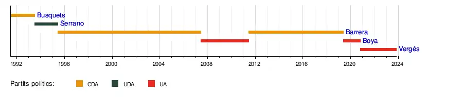 The Síndic d'Aran (Aran Syndic in Occitan) is the head of government of the Val d'Aran, an autonomously governed region within the Province of Lleida of Catalonia, Spain. The Síndic leads the thirteen-member Conselh Generau d'Aran, the governing body of the region. The office of Síndic d'Aran and the larger autonomous government were created in June 1991.