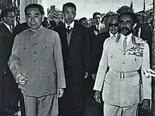 China originally had close ties with the anti-apartheid and liberation movement, African National Congress (ANC), in South Africa, but as China's relations with the Soviet Union deteriorated and the ANC moved closer to the Soviet Union, China shifted away from the ANC towards the Pan-Africanist Congress.[34] The Soviets supported Joshua Nkomo's Zimbabwe African People's Union, and supplied them with arms; Robert Mugabe's attempts to gain Soviet support for his Zimbabwe African National Union were rebuffed, leading him to enter into relations with China.[35][36][37] China adopted several principles, among them was the support of the independence of African countries while investing in infrastructure projects.[38][39]