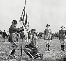 Russell was involved in the Territorial Force in an honorary capacity and on 12 May 1935, presented a guidon to the 9th (Wellington East Coast) Mounted Rifles at that year's training camp in Napier.[98]
