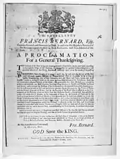 Bernard's wife was cousin to Lord Barrington, who became a Privy councillor in 1755.[11][12] Probably through his connections to Barrington and the Pownalls, he secured an appointment as governor of the Province of New Jersey on 27 January 1758, a post that became available upon the death of Jonathan Belcher.[13][14] Leaving some of his children with relatives, the couple sailed for North America with four of their children, arriving at Perth Amboy on 14 June 1758.[15]