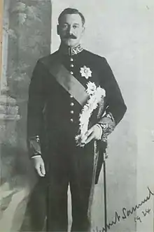 Samuel was the last member of the Liberal Party to hold one of the four Great Offices of State (as Home Secretary from 1931 to 1932 in the National Government of Ramsay MacDonald).[1][2] One of the adherents of "New Liberalism",[3] Samuel helped to draft and present social reform legislation while he was serving as a Liberal cabinet member.[4] Samuel led the party in both the 1931 general election and the 1935 general election, during which period the party's number of seats in parliament fell from 59 to 21.