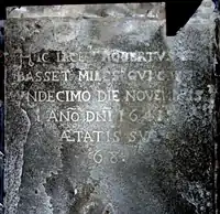 - Hic jacet Robertus Basset, Miles, qui (obiit) undecimo die Novembris An(n)o D(omi)ni 1641 aetatis suae 68 ("Here lies Robert Basset, Knight, who died on the 11th day of November in the year of Our Lord the 1641st, of his age the 68th")