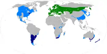 The species has reached other continents, such as Australia, South Africa and North America, through the export of timber and firewood. While invasion was prevented in North America for a long time, the sirex woodwasp established itself in New Zealand around 1900. There, it contributed to massive pine declines in the first half of the 20th century, spreading to Tasmania in the 1950s and then to the Australian mainland. Since 1980, it has reached pine plantations in Uruguay, and later also Argentina, Brazil and Chile; it was found in South Africa in 1994. The population increased in the Great Lakes area from 2004 on; the species had reached Vermont, New York, Pennsylvania, Ohio, and Michigan by 2009.[9][10] The wasps can swarm between 20 and 50 km (12 and 31 mi), and has been estimated to take until about 2050 to spread to the far southeast of the USA at the current spreading rate.[11][12]