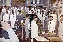 When the king undertook the traditional period as a Buddhist monk in 1956, Queen Sirikit acted as regent.[8] She performed her duties so well that she was officially named the Regent of Thailand and the King gave her the title 'Somdet Phra Nang Chao Sirikit Phra Borommarachininat' on his birthday, 5 December 1956. She became the second Siamese queen regent in Thai history. The first was Queen Saovabha Phongsri of Siam, who served as regent when her husband King Chulalongkorn travelled to Europe, and later became Queen Sri Patcharindra.