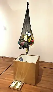 In her 1977 installation, Dolonan (Toys), Siti Ardyati takes from the iconography of wayang, often discussed as a court tradition and a form of 'high' culture. In contrast to courtly wayang kulit, which features lamb-skin leather puppets that are ornately painted on one side, Siti Adiyati's installation featured small wayang figures made of plastic, alongside other ornamental objects used as toys for children.[5] These materials were hung from or attached to a standing cuboid structure made of four wooden planks and rows of white fabric attached around them. Such materials dissolved the boundaries of 'high' and 'low' culture, situating court traditions within the realm of the everyday. It revealed how tradition is not immune to commodification for mass consumption and tourist trade, with tradition often used in official constructions of national culture.[5]