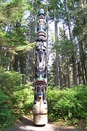From 1903 to 1905, District Governor John G. Brady set about acquiring Native totem poles from all over Alaska for display at the park; the majority of the poles came from Haida villages located on Prince of Wales Island, while others had been on display at the 1904 Louisiana Purchase Exposition.[11][12] Shortly thereafter, a group of influential Sitkans concerned about vandalism and the poor condition of the park in general pressured the federal government to declare the site a national monument.[5]