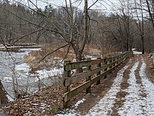 Like many creeks draining into Lake Ontario, Sixteen Mile Creek has cut a deep valley that is home to a broad range of wildlife, including whitetail deer, raccoons, foxes, opossum, and squirrels.[6] The forest contains tree species typical of the Carolinian forest habitat,[7] although since this is close to the northern limit of this zone, some are poorly represented. The total area of the drainage basin is 372 square kilometres (144 sq mi).[8]