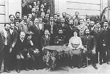 Amongst those supporting the Uganda Scheme was Israel Zangwill who feared a colony in Palestine would lead to an Orthodox revival “precluding modernity”. “We could not [...] lead a modern life there.”[26][27] Another supporter was Eliezer Ben Yehuda who was one of the few delegates with actual experience of living in Palestine.[28] Paradoxically both the reformist Hamizrachi and the ultra orthodox Mizrachi delegates tended to support the plan. Chaim Weizmann, one of the most outspoken of the new generation of Zionists, gave a “violent speech” against, whereas his father and brother, who were also delegates, were in favour. Martin Buber was one of the minority of Western European Jews who vote against. Nachman Syrkin gave a speech criticising Herzl. The delegate from Kishnev as well as the entire Russian leadership voted against. The artist Ephraim Moses Lilien and 23 year old Vladimir Jabotinsky were also against.[29][30][26]