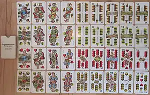 The choice of card deck varies from region to region, but the game is usually played with French suited cards or Double German cards. For tournaments in which players of different regions compete, there are special German-French decks. Sechsundsechzig is played with a pack of 24 cards.