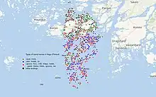 ![]() Islands in Nagu, color coded by name suffix – -holm(en), -skär(et) etc. | |