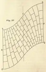 In performing his calculations Nicholson considered the arch barrel to be made from one ring of stones and of negligible thickness and therefore he developed only the intrados.[27] The idea was expanded in Charles Fox's 1836 publication On the Construction of Skew Arches, in which he considered the intrados of the barrel and the extrados as separate surfaces mapped onto concentric cylinders by drawing a separate development for each.[2] This approach had two advantages. Firstly, he was able to develop a theoretical third, intermediate surface midway between the intrados and the extrados, which allowed him to align the centre of each voussoir, rather than its inner surface, along the desired line, thereby better approximating the ideal placement than Nicholson was able to achieve.[2][28] Secondly, it enabled him to develop an arbitrary number of concentric intermediate surfaces so as to plan the courses in multi-ring skew arch barrels, allowing them for the first time to be constructed in brick, and therefore much more economically than was previously possible.[29]