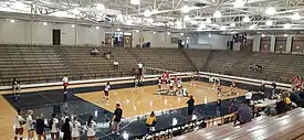 The Fieldhouse underwent a major facelift in the summer of 2014, as a brand new playing court was installed with a large Skyhawk head logo placed at midcourt. That followed an overhaul in the summer of 2011 that featured a large “Skyhawk Volleyball” screenprint was placed on the west wall. A total of 115 temporary plastic seats were also installed in the south bleachers, behind the bench areas. The volleyball locker room also went through a drastic renovation in the summer of 2017, completed just in time for the start of the season.