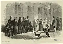 The market for buying and selling enslaved people continued during the war, as did the market for hiring and hiring out enslaved labor.[3] Although the price of enslaved workers grew, it did not keep up with inflation, causing the real price of enslaved people to decline during the Civil War. The prices of people held in slavery rose and fell in part with the prospects for Confederate victory.[4] In 1860, the average enslaved person sold in Virginia brought $1,500, and a "prime field hand" in New Orleans brought $1,800. In 1863, enslaved people in Richmond sold for $4,000 or $5,000 and in Texas for $2,500 to $3,500, depending on skill sets.[5] Before the start of the war, the expansion of slavery was an important political and economic goal for slaveholders. This continued during the war, and there was a large expansion of slavery into Texas, which had been made a state in 1845.[6] However, late in the war, many slave owners recognized the increasing probability that slavery would be ended, and there is evidence that they increased their attempts to sell the people they held in slavery.[7]