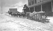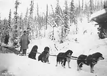 The Alaskan Gold Rush brought renewed interest in the use of sled dogs as transportation.[12] Most gold camps were accessible only by dogsled in the winter.[13] "Everything that moved during the frozen season moved by dog team; prospectors, trappers, doctors, mail, commerce, trade, freighting of supplies … if it needed to move in winter, it was moved by sled dogs."[12] This, along with the dogs' use in the exploration of the poles, led to the late 1800s and early 1900s being nicknamed the "Era of the Sled Dog".[14]